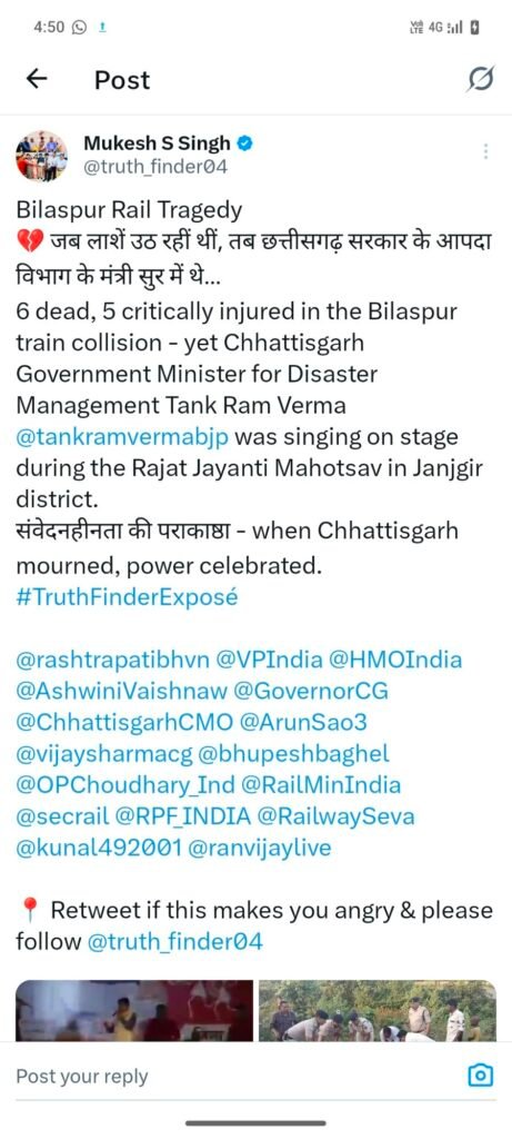 रायपुर/बिलासपुर । बिलासपुर रेल हादसे ने पूरे प्रदेश को शोक और स्तब्धता में डाल दिया है। हादसे में अब तक 11 यात्रियों की मौत की पुष्टि हो चुकी है, जबकि 20 से अधिक लोग गंभीर रूप से घायल बताए जा रहे हैं। घायलों को नजदीकी अस्पतालों में भर्ती कराया गया है, जहाँ उनका उपचार जारी है। प्रशासन, एनडीआरएफ और रेलवे की रेस्क्यू टीमें राहत कार्य में लगी हुई हैं। इसी बीच, राज्य के आपदा प्रबंधन मंत्री टंक राम वर्मा एक अलग ही कारण से चर्चा में आ गए। हादसे के कुछ ही घंटों बाद उनका एक वीडियो सोशल मीडिया पर वायरल हो गया, जिसमें वे जांजगीर में आयोजित राज्य अलंकरण एवं रजत जयंती कार्यक्रम में मंच पर गीत गाते दिखाई दे रहे हैं। वीडियो सामने आने के बाद जनता में भारी नाराजगी देखने को मिल रही है। सोशल मीडिया पर लोग मंत्री के इस आचरण को ‘संवेदनहीन’ बताते हुए सवाल उठा रहे हैं कि जब पूरा प्रदेश दुर्घटना के दर्द में है, तब आपदा प्रबंधन विभाग के मंत्री का ऐसा व्यवहार कितना उचित है।