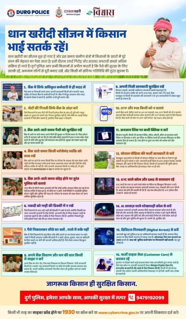 दुर्ग पुलिस ने यह भी बताया कि फर्जी ग्राहक सेवा नंबरों से भी किसान ठगी के शिकार हो रहे हैं। इसलिए किसी भी समस्या के लिए केवल बैंक के आधिकारिक हेल्पलाइन या शाखा से ही संपर्क करें।