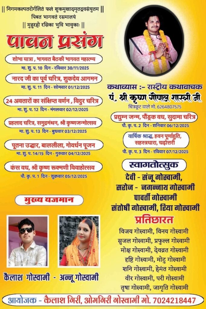 • गोस्वामी परिवार की ममता मई मां स्वर्गीय श्रीमती कुंती देवी गोस्वामी की वार्षिक श्राद्ध में चित्रकूट के कथा वाचक पंडित श्री कृष्ण गोपाल शास्त्री जी होंगे वेदव्यास।