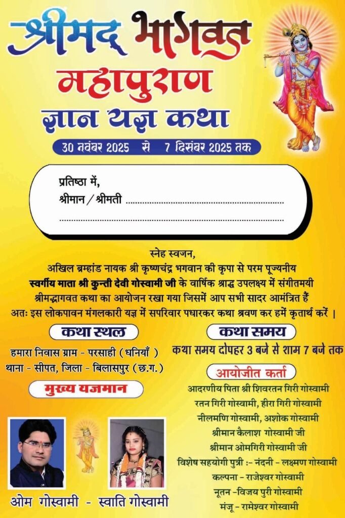 सीपत । परसाही (धनियां)में 30 नवंबर से 6 दिसंबर तक बहेगी संगीतमई अमृत रूपी श्रीमद् भागवत कथा ज्ञान यज्ञ की धारा प्रारंभ होगी l जिसमें गोस्वामी परिवार की ममता मई मां स्वर्गीय श्रीमती कुंती देवी गोस्वामी की वार्षिक श्राद्ध में चित्रकूट के कथा वाचक पंडित श्री कृष्ण गोपाल शास्त्री जी की मुखार वृंद से कथा का श्रवण करेंगे l प्रतिदिन कथा प्रारंभ होने का समय दोपहर 3बजे से शाम 7 बजे महाआरती से संपन्न होगी l कथा का शुभारंभ शोभायात्रा के साथ भागवत महात्म्य 30 नवंबर से प्रारंभ होगी द्वितीय दिन नारद जी का पूर्ण चरित्र, सुखदेव जी का आगमन तृतीय दिवस भगवान के 24 अवतारों का संक्षिप्त वर्णन, विदुर चरित्र चतुर्थ दिन प्रहलाद चरित्र समुद्र मंथन कृष्ण जन्मोत्सव पंचम दिन की कथा में पूतना उद्धार, बाल लीला, गोवर्धन पूजा और अंतिम दिवस 5 दिसंबर को कंस वध श्री कृष्ण रुकमणी विवाह उत्सव के साथ कथा का समापन होगा ।