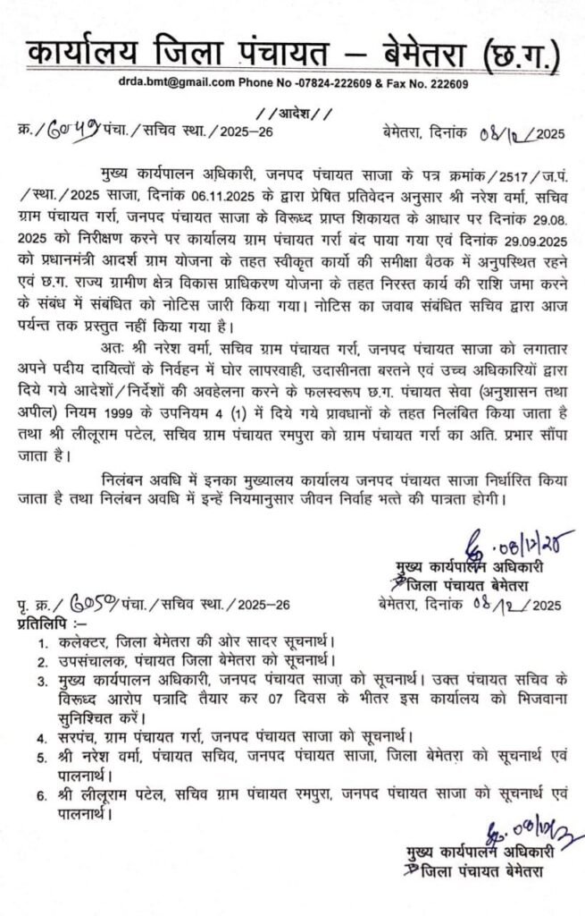 बेमेतरा । जिला बेमेतरा के जनपद पंचायत साजा अंतर्गत ग्राम पंचायत गर्रा के सचिव नरेश वर्मा को पदस्थ दायित्वों के निर्वहन में लगातार लापरवाही और उदासीनता बरतने पर निलंबित कर दिया गया है। यह कार्रवाई जनपद पंचायत साजा के मुख्य कार्यपालन अधिकारी द्वारा भेजी गई जांच रिपोर्ट के आधार पर की गई है। प्राप्त जानकारी के अनुसार ग्राम पंचायत गर्र के विरुद्ध प्राप्त शिकायतों पर 29 अगस्त 2025 को निरीक्षण किया गया, जिसमें पंचायत कार्यालय बंद पाया गया। इसके अलावा 29 सितंबर 2025 को प्रधानमंत्री आदर्श ग्राम योजना एवं छ.ग. राज्य ग्रामीण क्षेत्र विकास प्राधिकरण योजना के तहत अनुमोदित कार्यों की समीक्षा बैठक में भी सचिव अनुपस्थित रहे।